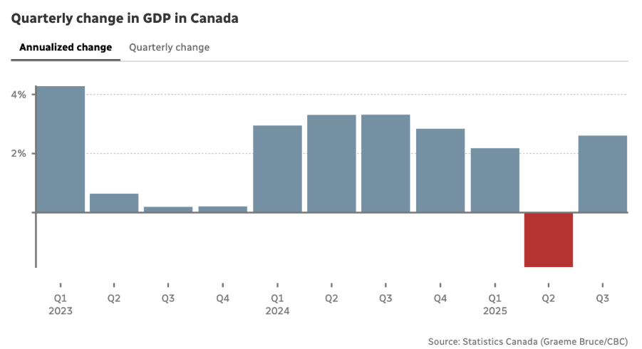 Benchetrit, J. (2025, November 28). Canada’s economy grew at an annualized rate of 2.6% in 3rd Quarter . CBC News. https://www.cbc.ca/news/business/canada-gdp-q3-2025-9.6995959