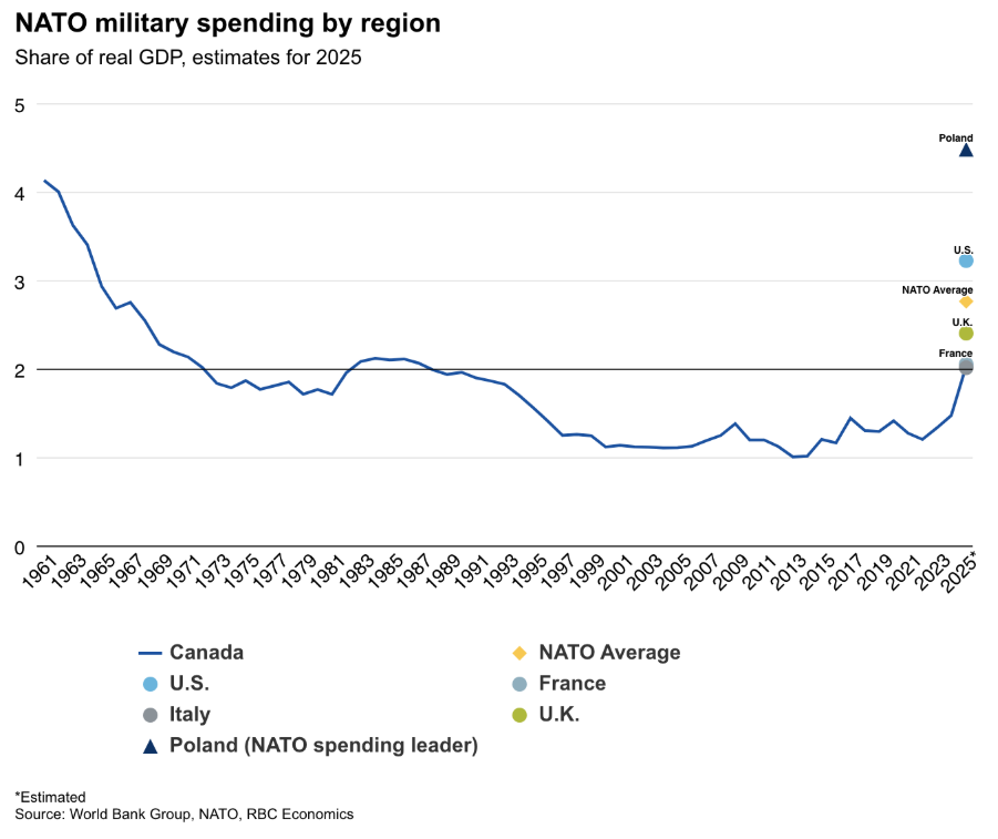 Canada’s GDP grew 2.6% in Q3 2025, higher than expected, largely thanks to an 82% surge in defence spending (Benchetrit, 2025). This helped offset soft household spending and stagnant business investment, allowing the country to narrowly dodge a technical recession.